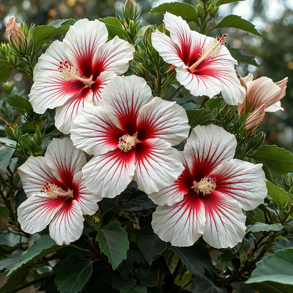 Гибискус «Рэд Элеганс» — это воплощение изящества и грации. Представьте: крупные белоснежные цветки, украшенные тонкими красными нитями, словно рубиновые прожилки, пронизывающие нежный фарфор. Этот гибискус словно создан для того, чтобы подчеркнуть изысканность и элегантность вашего сада. Его красота завораживает и дарит ощущение гармонии и совершенства.